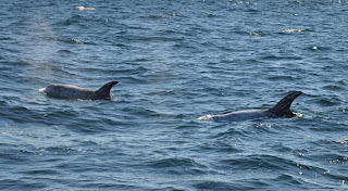 I was reading Bowditch, the navigational rules and methods bible... okay I was starting to, I'd made it as far as the table of contents. Dad stuck his head up to see how things were going and spotted dorsal fins! *happy dance* They were just off our starboard bow!